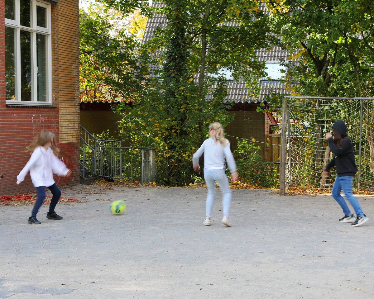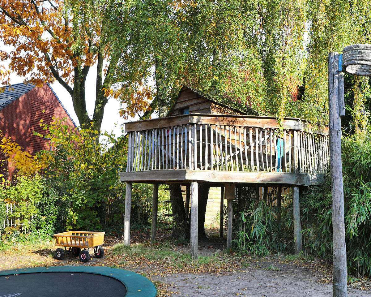 Buiten is er ook van alles te doen: er is een groot plein met twee doelen en twee basketballkorven. Er wordt met name samen met de groepsleiding heel veel gevoetbald! Verder is er een trampoline, schommel, een boomhut en een moestuin.